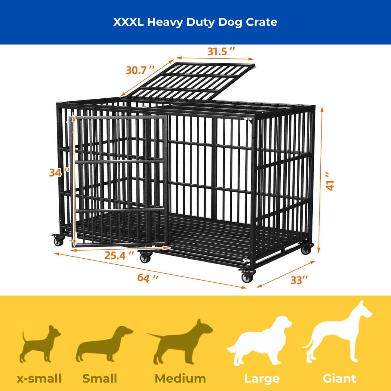 This 64-inch extra-large heavy-duty dog crate is designed to keep your big dog secure, comfortable, and stress-free at all times. Built from reinforced steel pipes and crafted with fish-scale welding technology to keep large dogs safely and securely contained.