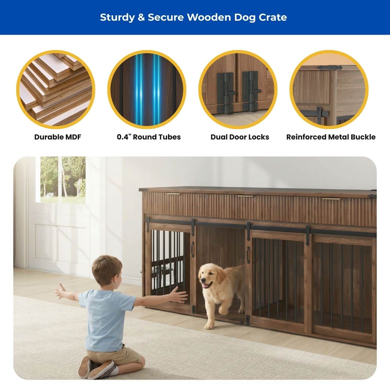 Built from heavy-duty MDF wood and steel, this sturdy crate delivers durable construction, safe containment, and a refined furniture finish. The sliding dog crate doors glide smoothly on an overhead metal track, making them easy to open and close while staying firmly locked in place. A secure metal latch and sliding door lock groove help prevent accidental openings, giving peace of mind for families with kids and energetic pets.