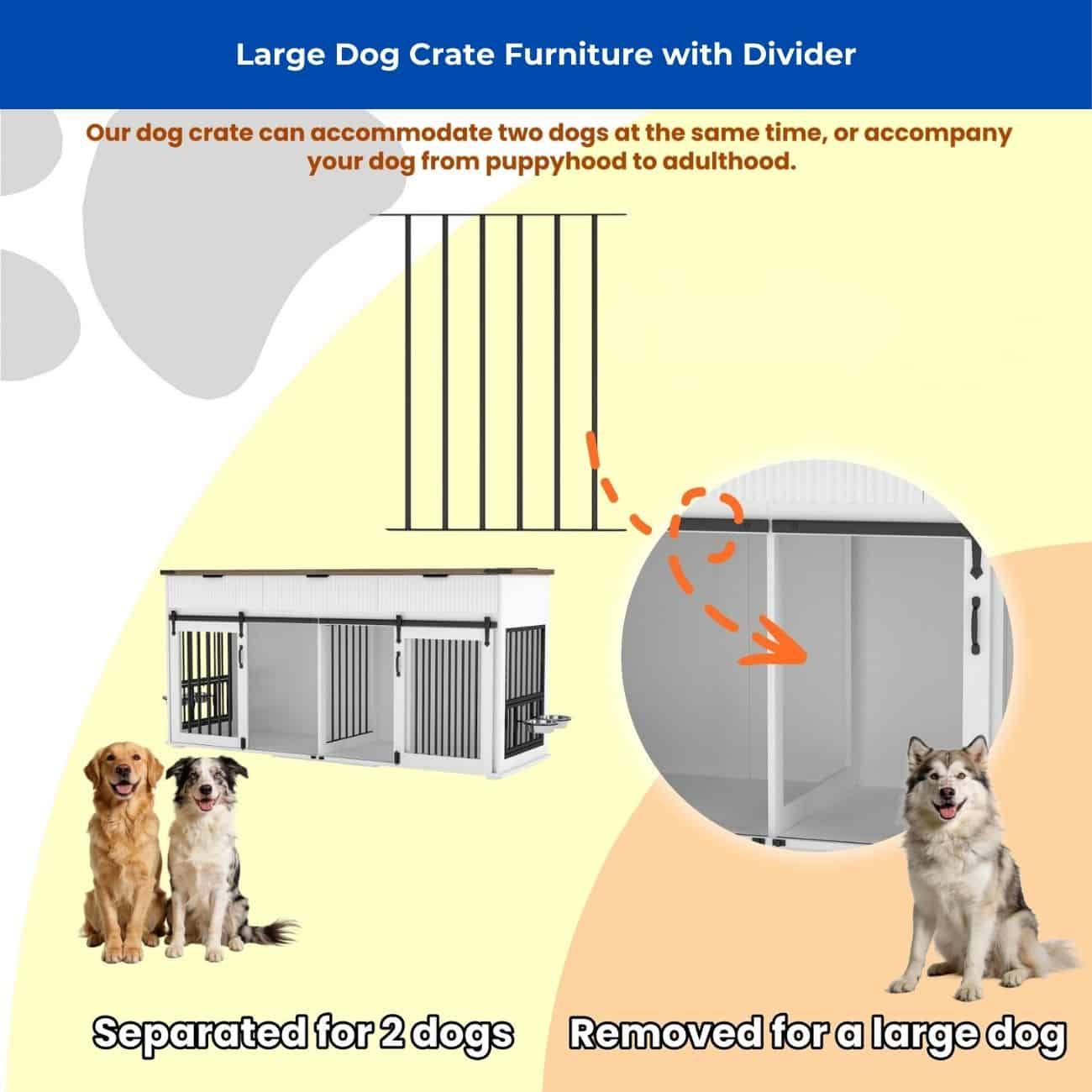 This large double dog crate furniture features a space-saving design with a removable divider and built-in storage, designed to comfortably house two small-to-medium dogs without compromising your home décor. Ideal for apartments, family rooms, or shared living spaces, it lets you crate two dogs in one secure enclosure while doubling as a stylish side table or console.