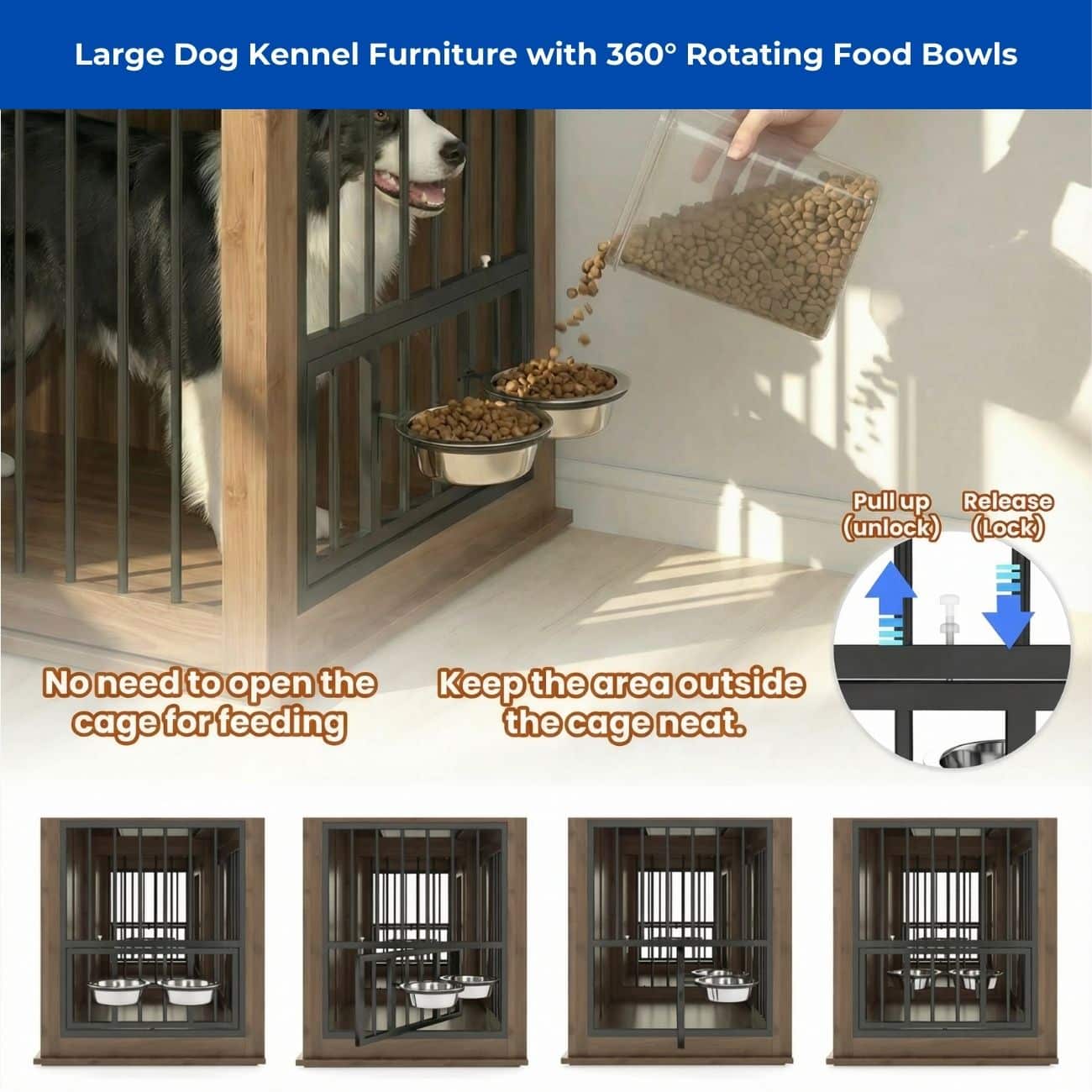 Feeding is made easier with two 360° rotatable feeders and four stainless steel bowls, allowing pets to eat from inside or outside the crate. The bowls are dishwasher-safe, anti-spill, and securely mounted for clean, stress-free mealtimes. A built-in power station with Type-C, USB ports, and AC outlets, housed in a chew-proof cable enclosure, adds modern convenience for charging devices safely nearby.