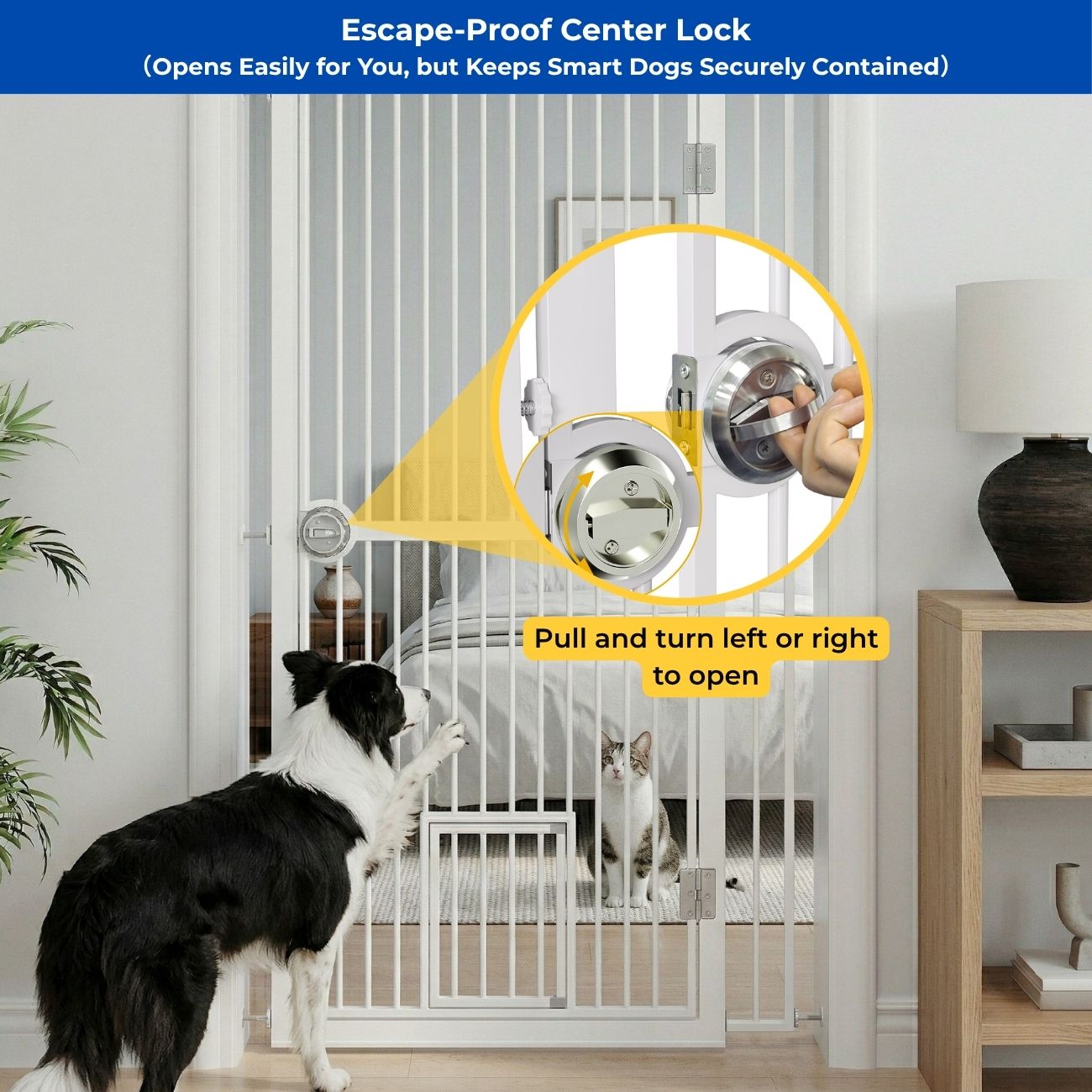 The safety lock with unlocking pull ring allows quick operation for adults while preventing smart dogs from opening the gate. Narrow bar spacing prevents small pets from slipping through, improving containment and safety.