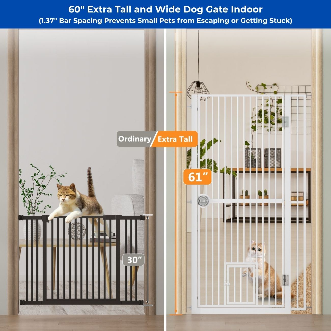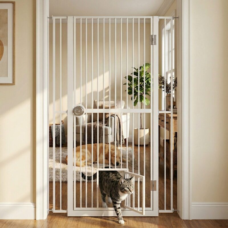 The 61-in Extra Tall Indoor Dog & Cat Gate with Small Door blocks jumpers, restricts large pets, and protects indoor living spaces. It fits doorways and hallways, making it suitable for multi-pet households that require controlled access between rooms.