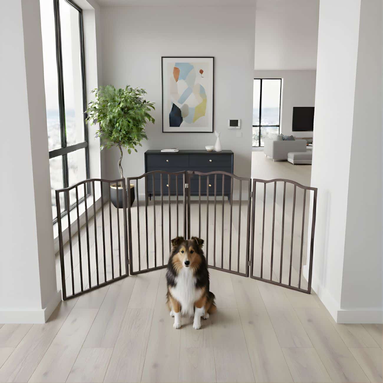 • This 4-panel pet gate is freestanding and does not require drilling or installation.