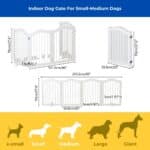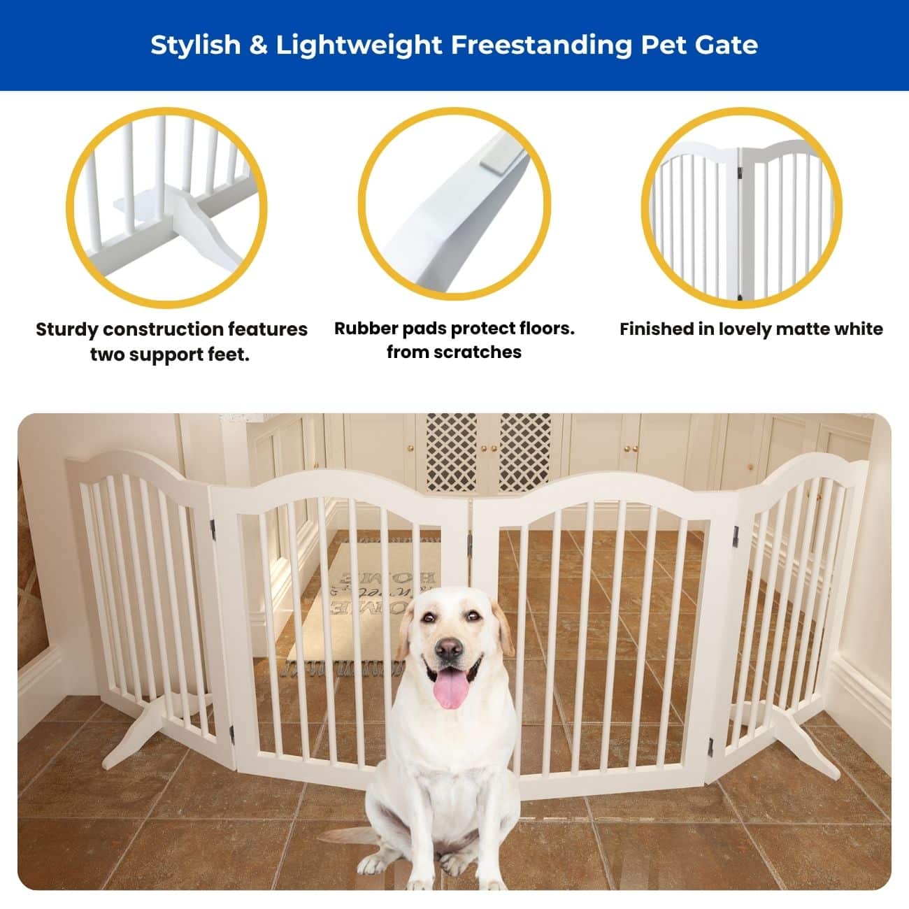 This stylish wooden dog gate keeps your pet out of certain rooms without detracting from your home décor. Its freestanding design lets you create a customized barrier anywhere, anytime you need it. Featuring four hinged panels, the gate extends from 40 to 80 inches to fit most doorways, hallways, or to block off fireplaces, Christmas trees, and other hazards. Crafted from 0.7″-thick MDF boards and finished in a minimalist white coating, it offers a damage-free setup and portable containment for renters and homeowners with well-behaved small to medium dogs. Rubber pads on the bottom of panels and support feet help prevent floor scratches and keep the gate securely in place.