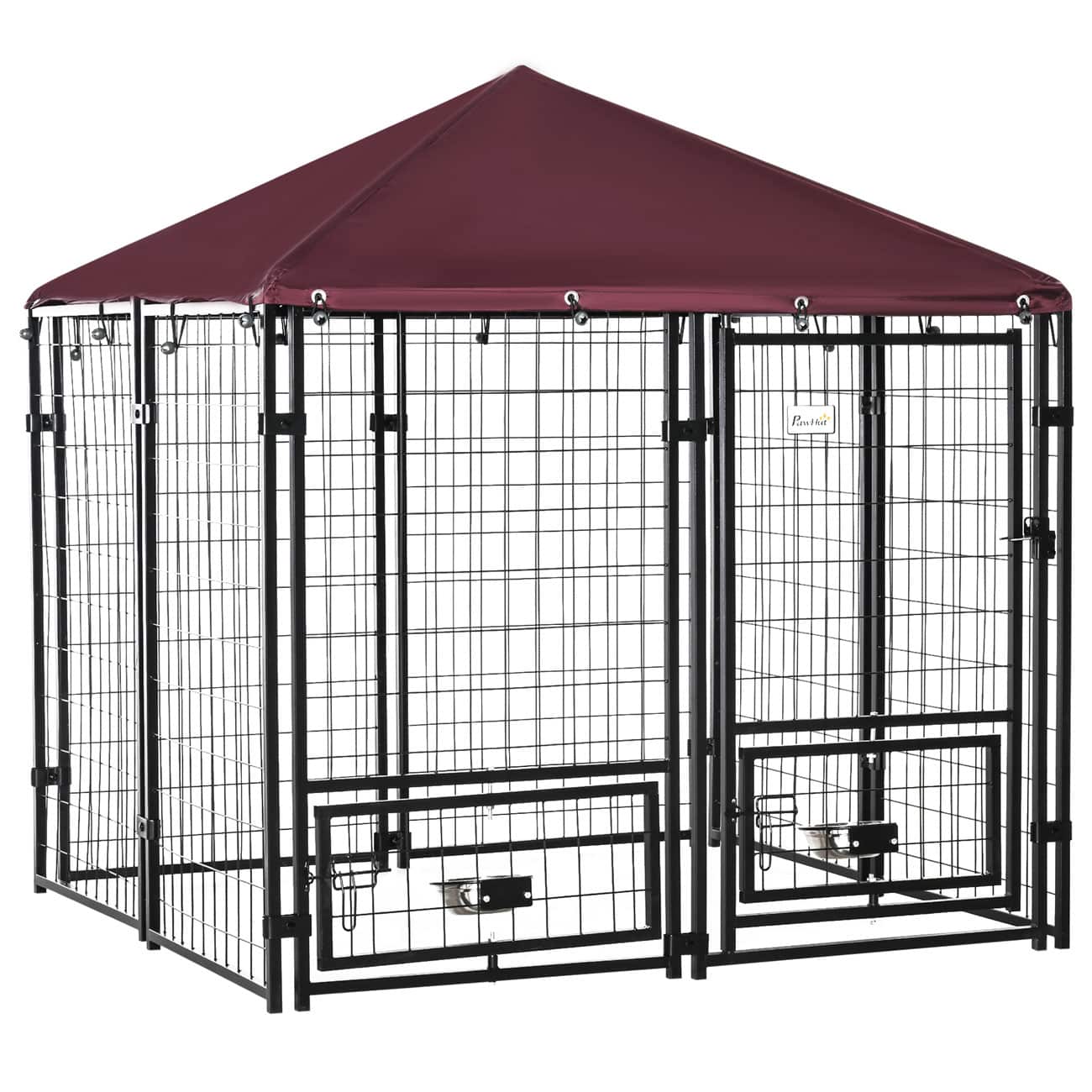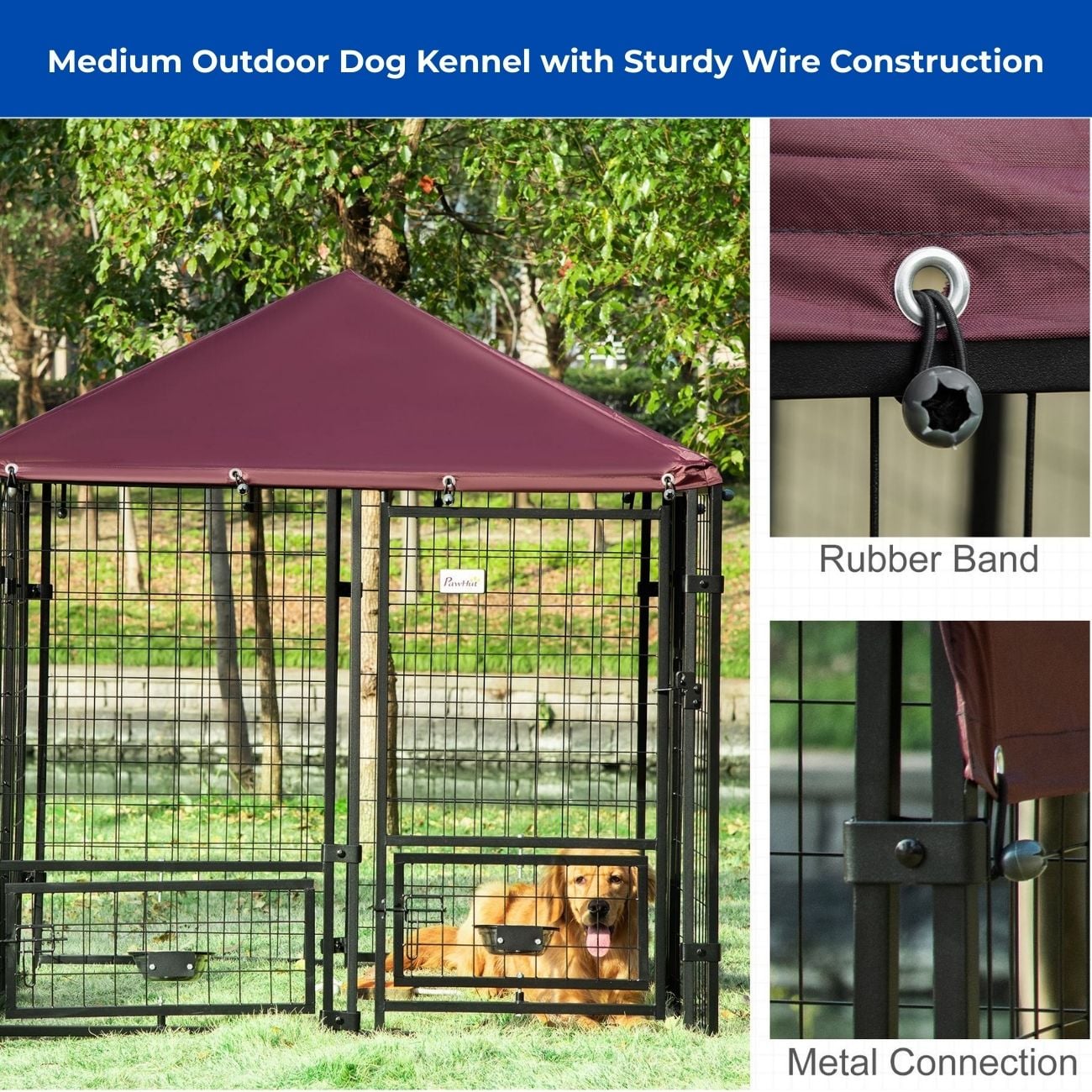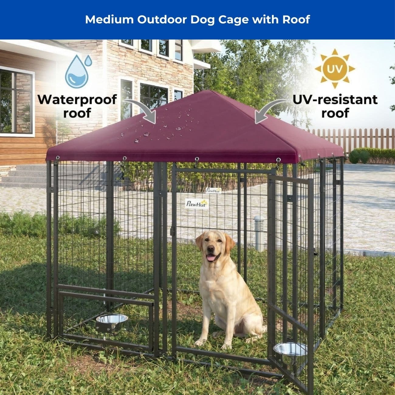 • Shaded Kennel With Weather Cover: The kennel with roof includes an Oxford fabric cover that blocks direct sun and light rain. This covered dog kennel keeps pets cooler and more comfortable during outdoor time.